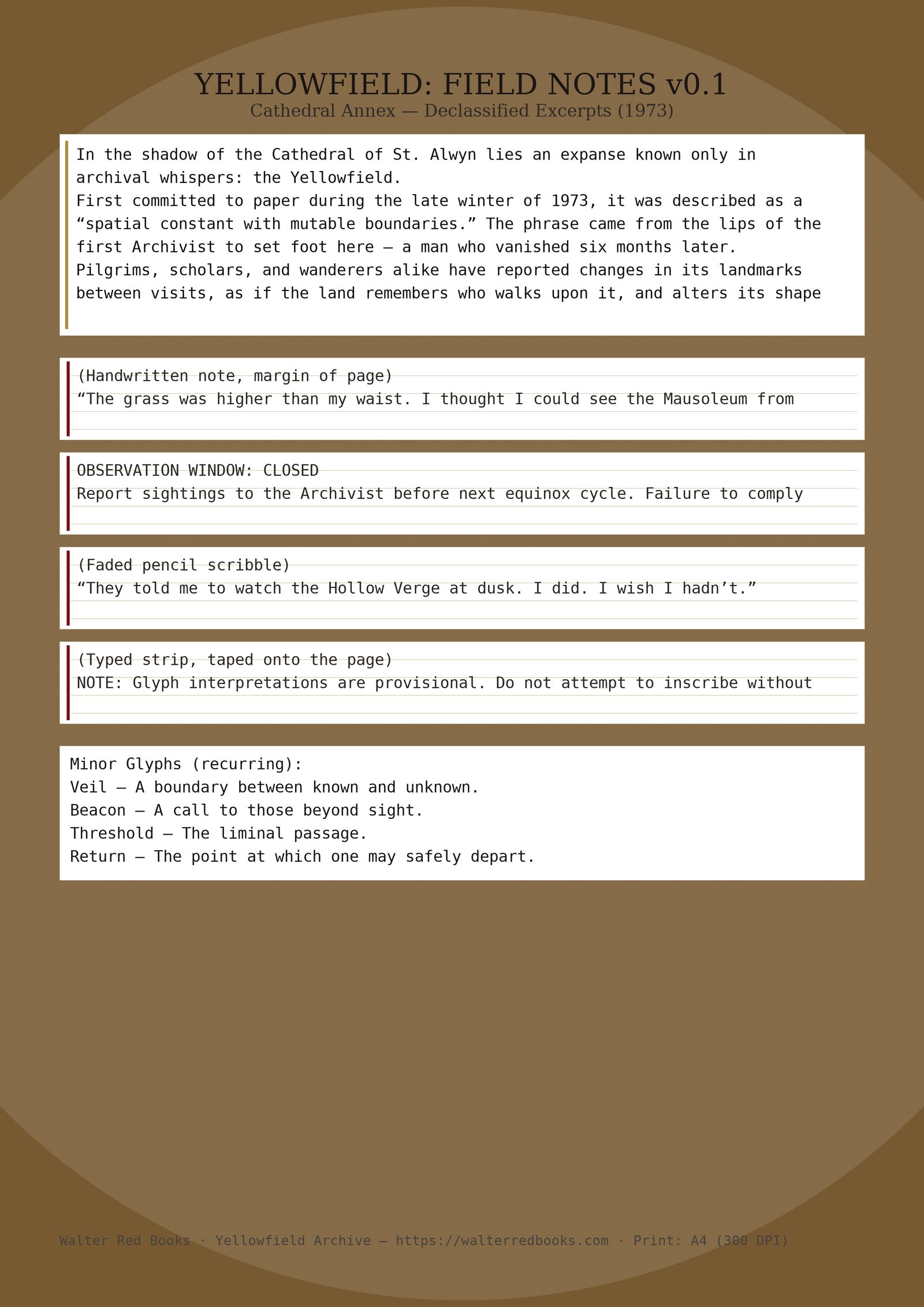 First committed to paper during the late winter of 1973, it was described as a “spatial constant with mutable boundaries.” The phrase came from the lips of the first Archivist to set foot here — a man who vanished six months later.